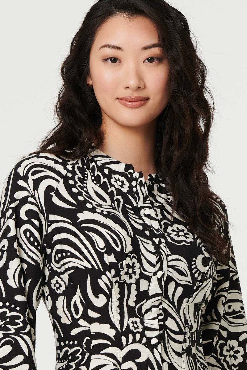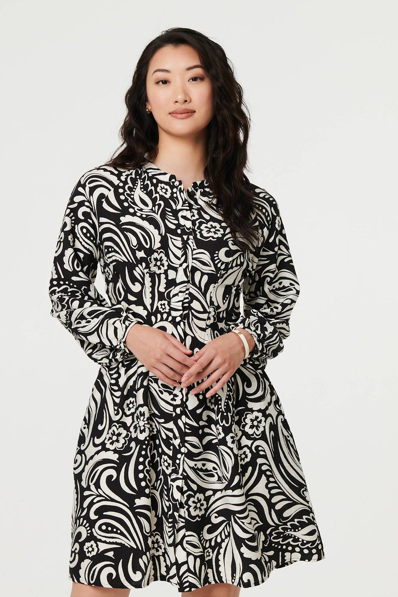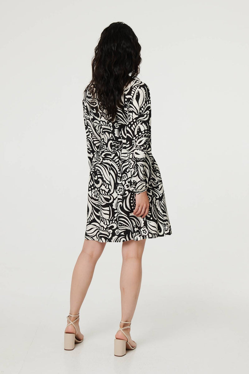 Printed Long Sleeve Knee Length Dress in Black
