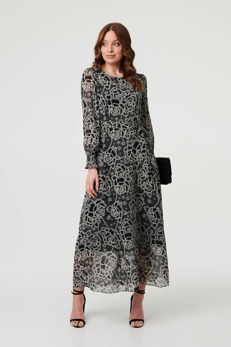 Dress for special occasions in style in this beautiful maxi dress. It's made from a semi sheer layered material and has a flattering tie waist. The round neck and maxi length skirt will elongate your figure for a glamorous evening look. Wear it with heels and your favourite clutch bag.