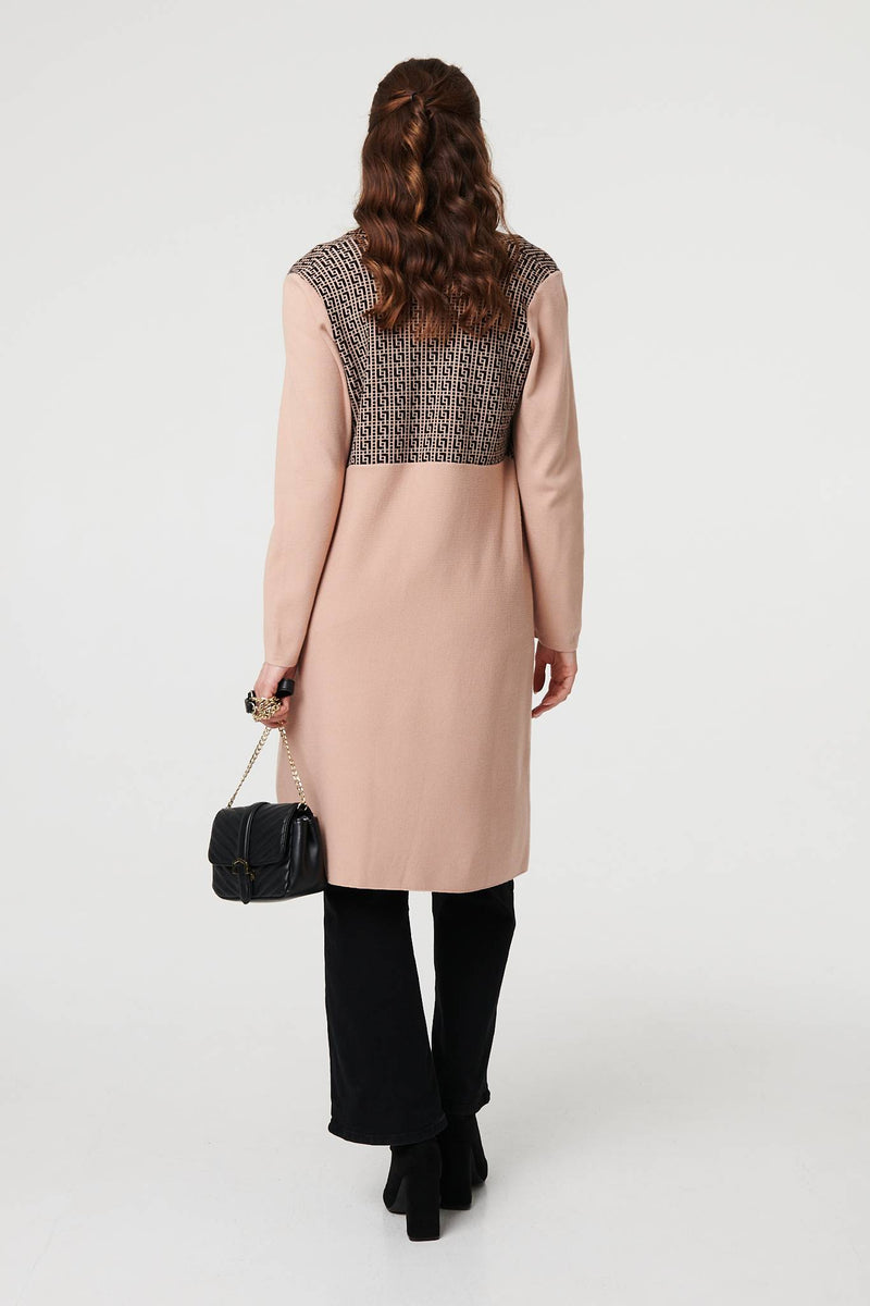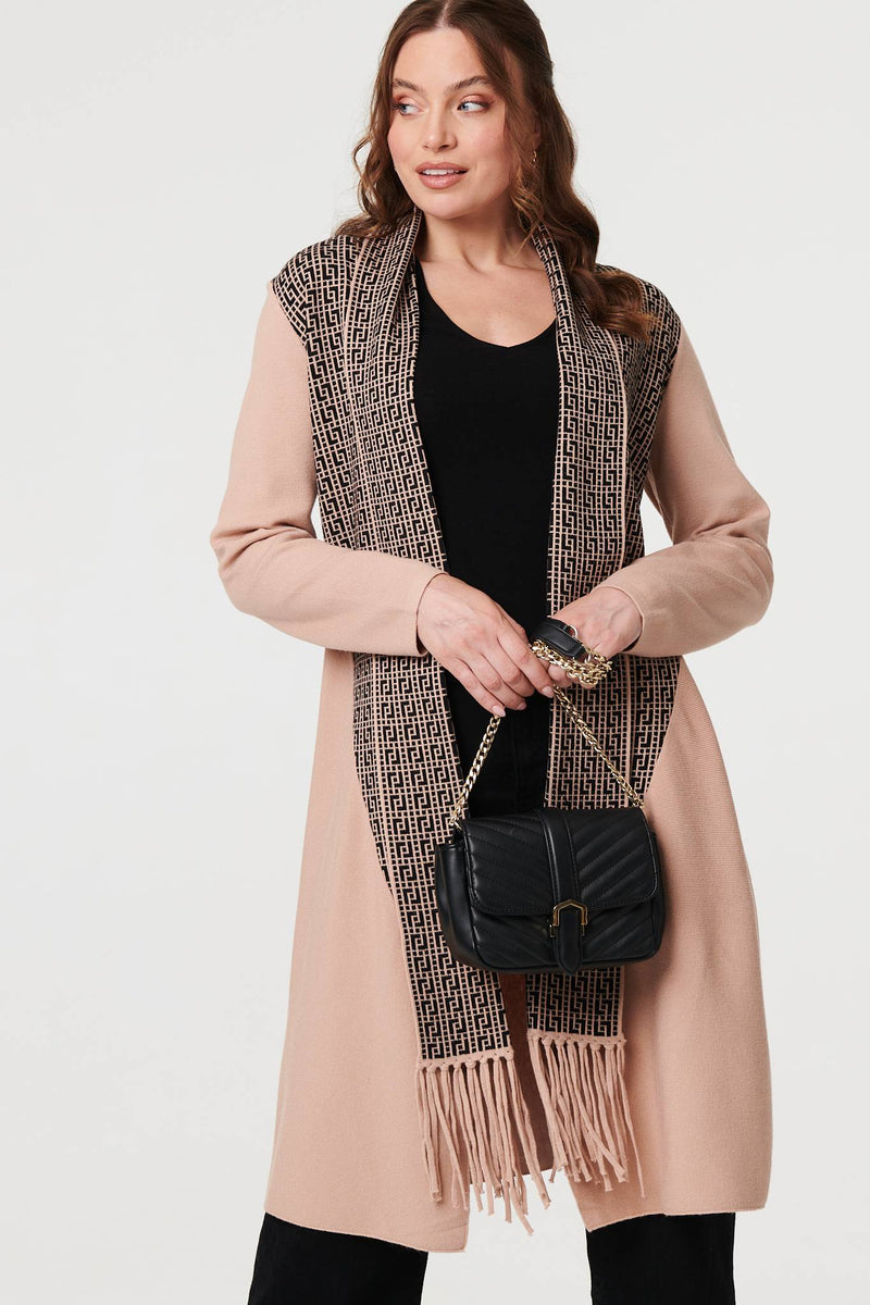 This elegant coat includes a scarf attachment, complete with fringed hems. It has long sleeves, a longline hem and an open front shape. Wear it over your smart or formal outfits for extra warmth on a chilly day.