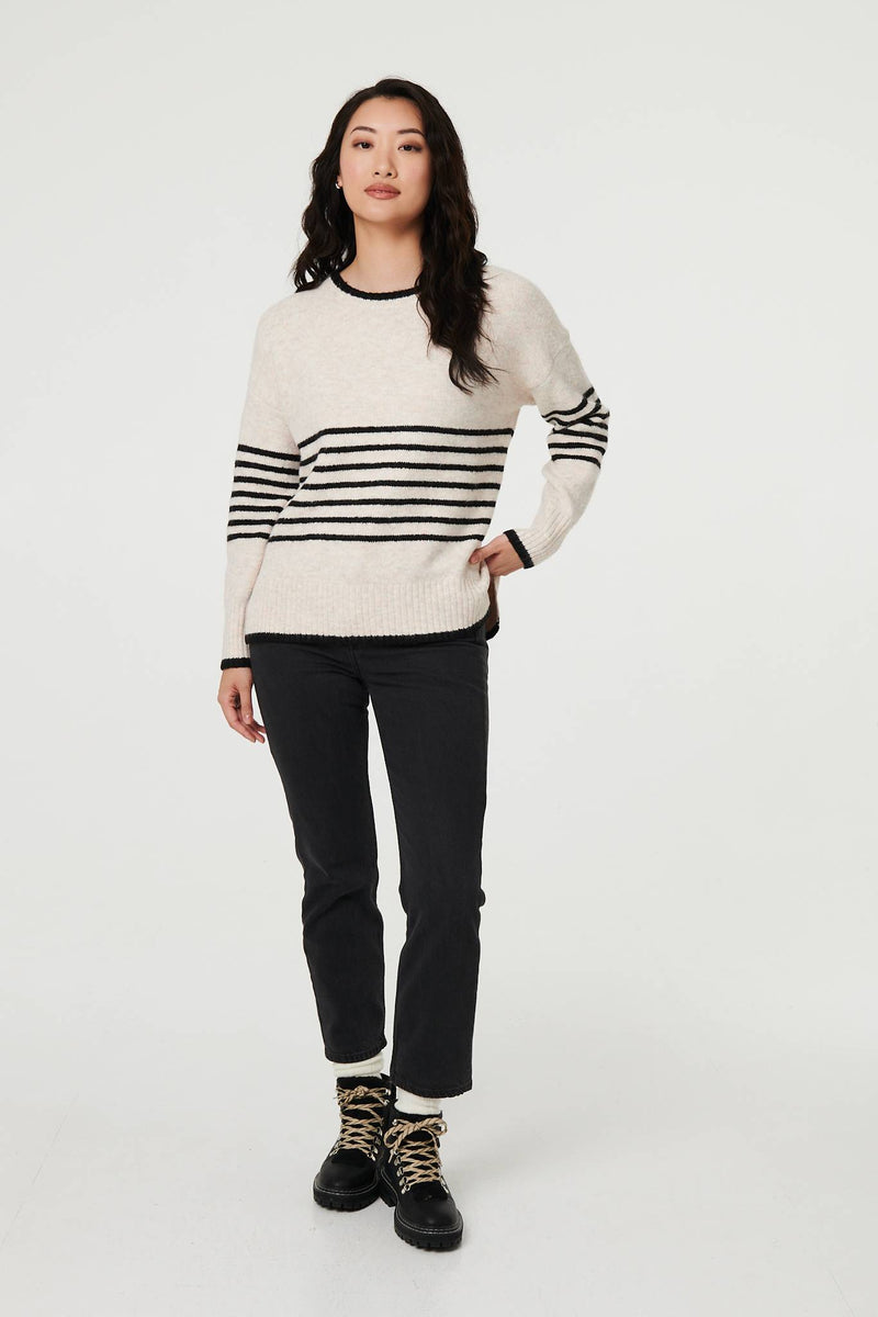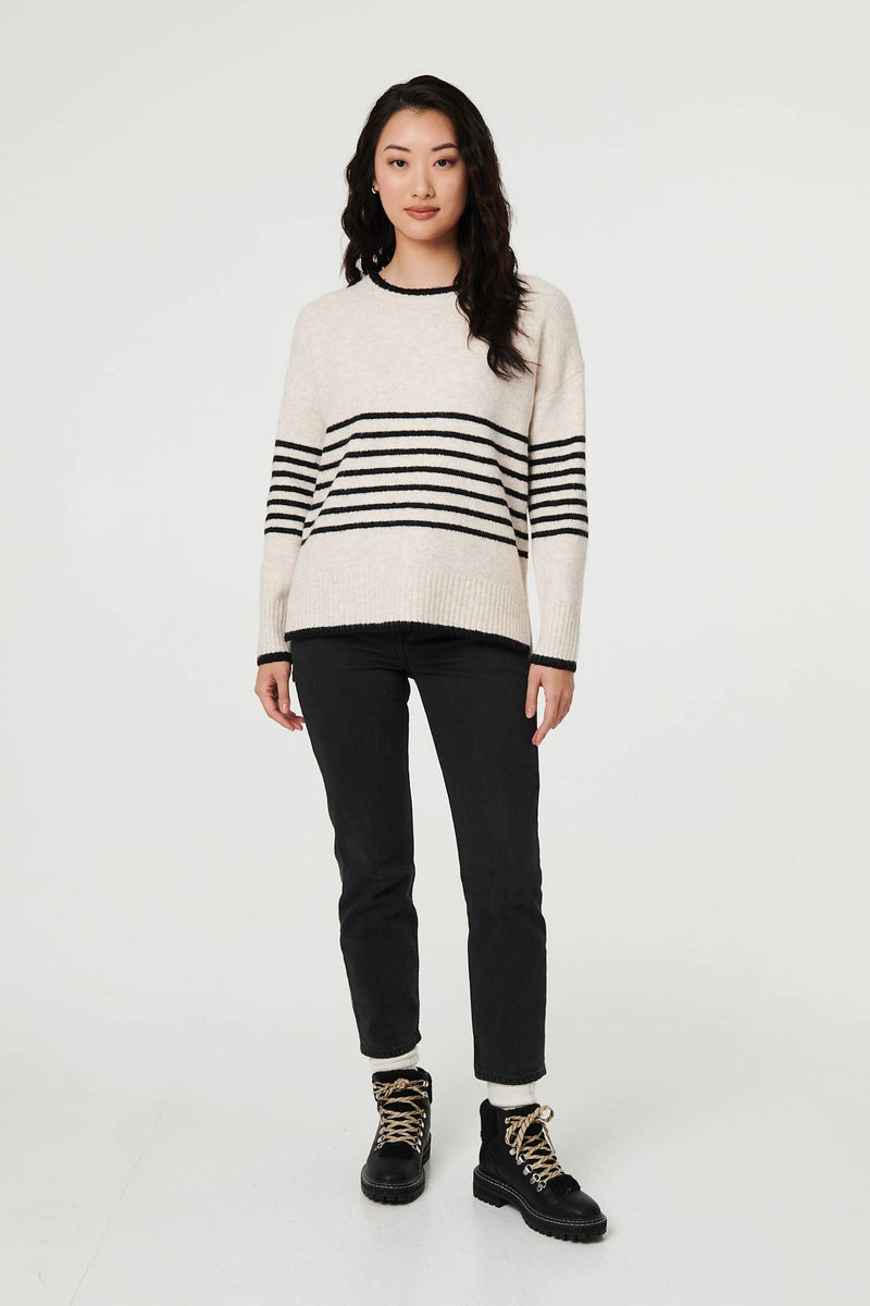 Add this comfortable jumper to your autumn wardrobe. It has long sleeves with drop shoulders, a round neck, and a hip length hem. It layers elegantly over trousers or a skirt.