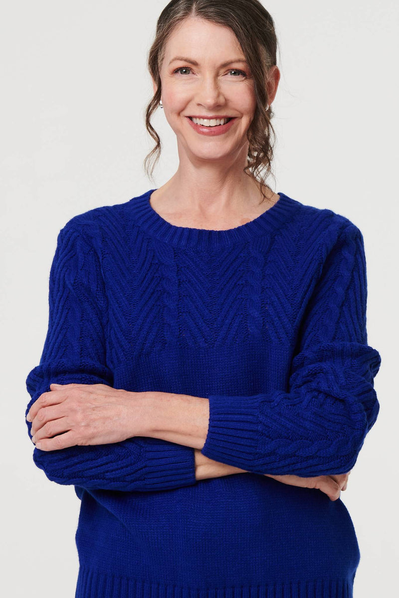 This comfortable jumper is made from a textured knit material. It has a round neck and long sleeves, with a slim hip length fit. Wear it with blue denim for a relaxed look.