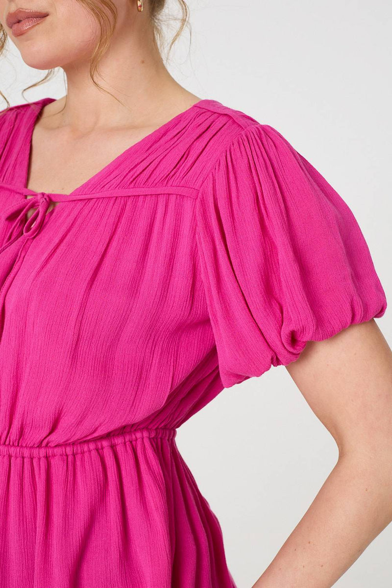 This ruched blouse will flatter all figures for a tummy-slimming effect. It has a tie waist and a tie neck, so you can easily adjust the fit for the perfect shape. It also has short puff sleeves, a peplum cut and a hip length hem. Wear it with smart trousers or a skirt for a day at work or an evening out with friends.