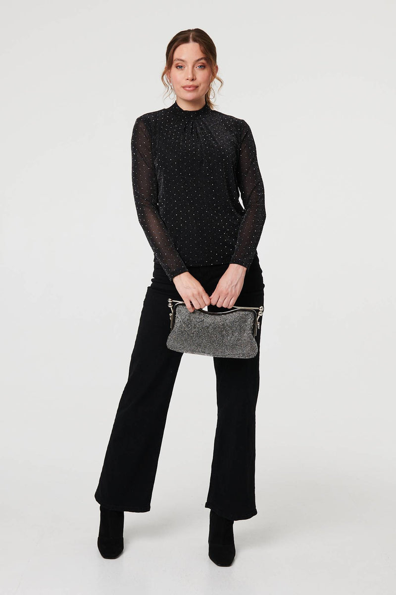 This sparkly top is finished with shimmery embellishments and a semi sheer mesh layer. It has a flattering ruched high neck, long sleeves and a slim fit. Dress for an evening out in style by pairing this top with a faux leather midi skirt, or your favourite smart jeans.