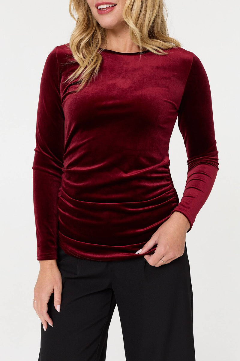 This elegant top is made from a soft velour texture material. It has a flattering slim fit, long sleeves and a round neck. It also features a hip length hem that you can leave loose over your trousers or tuck into a midi skirt for an elevated evening look.