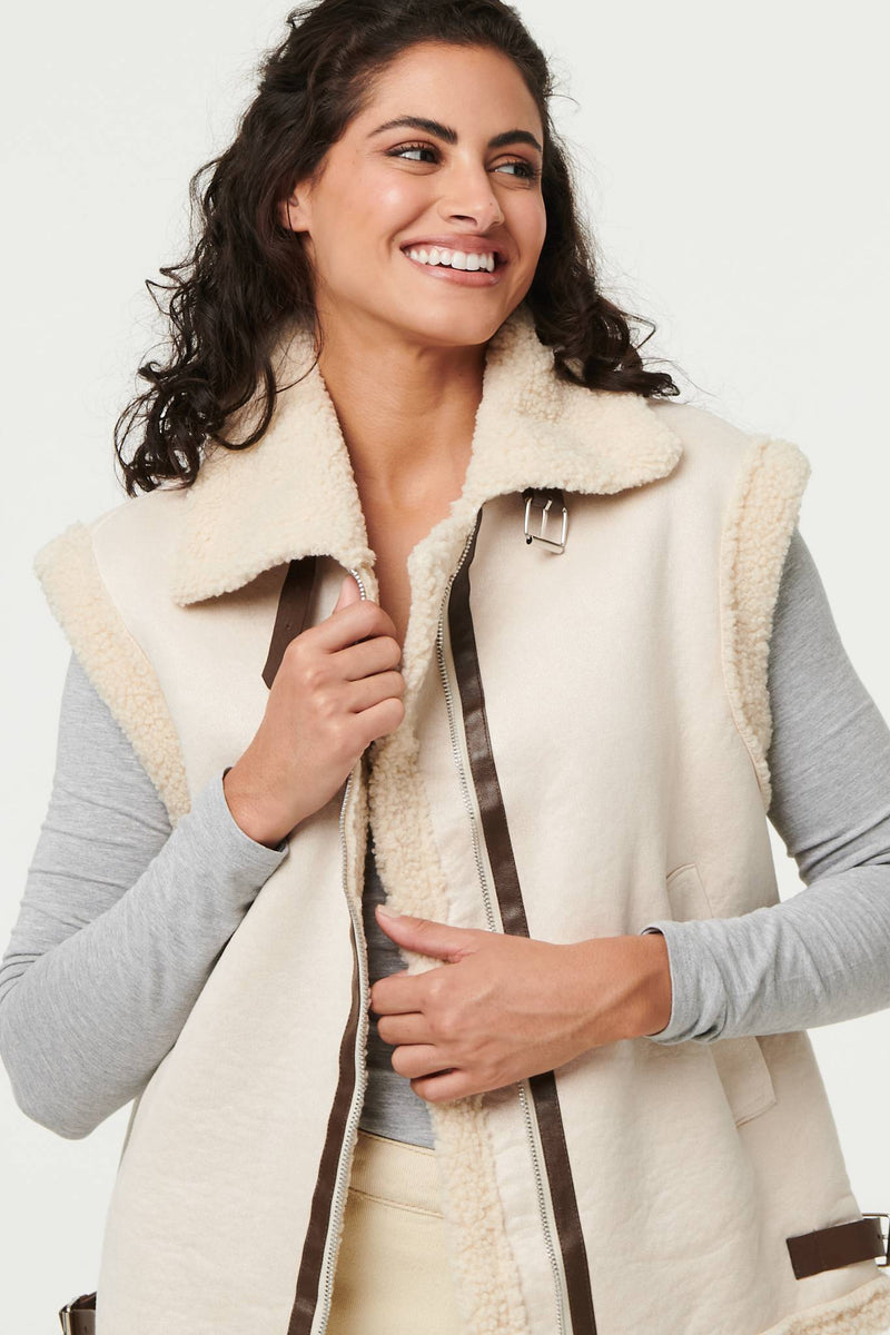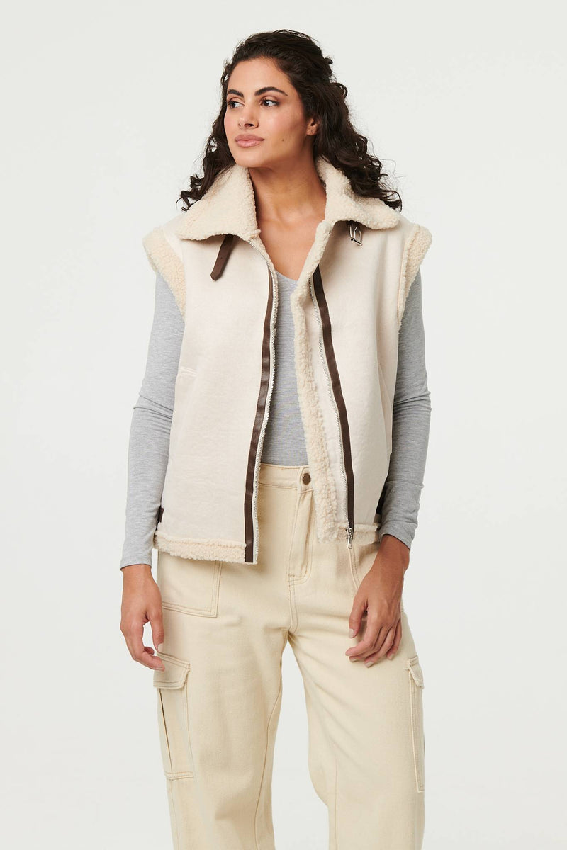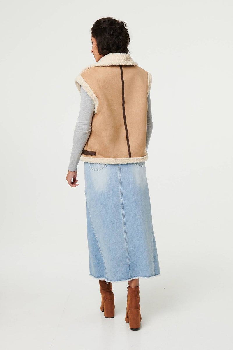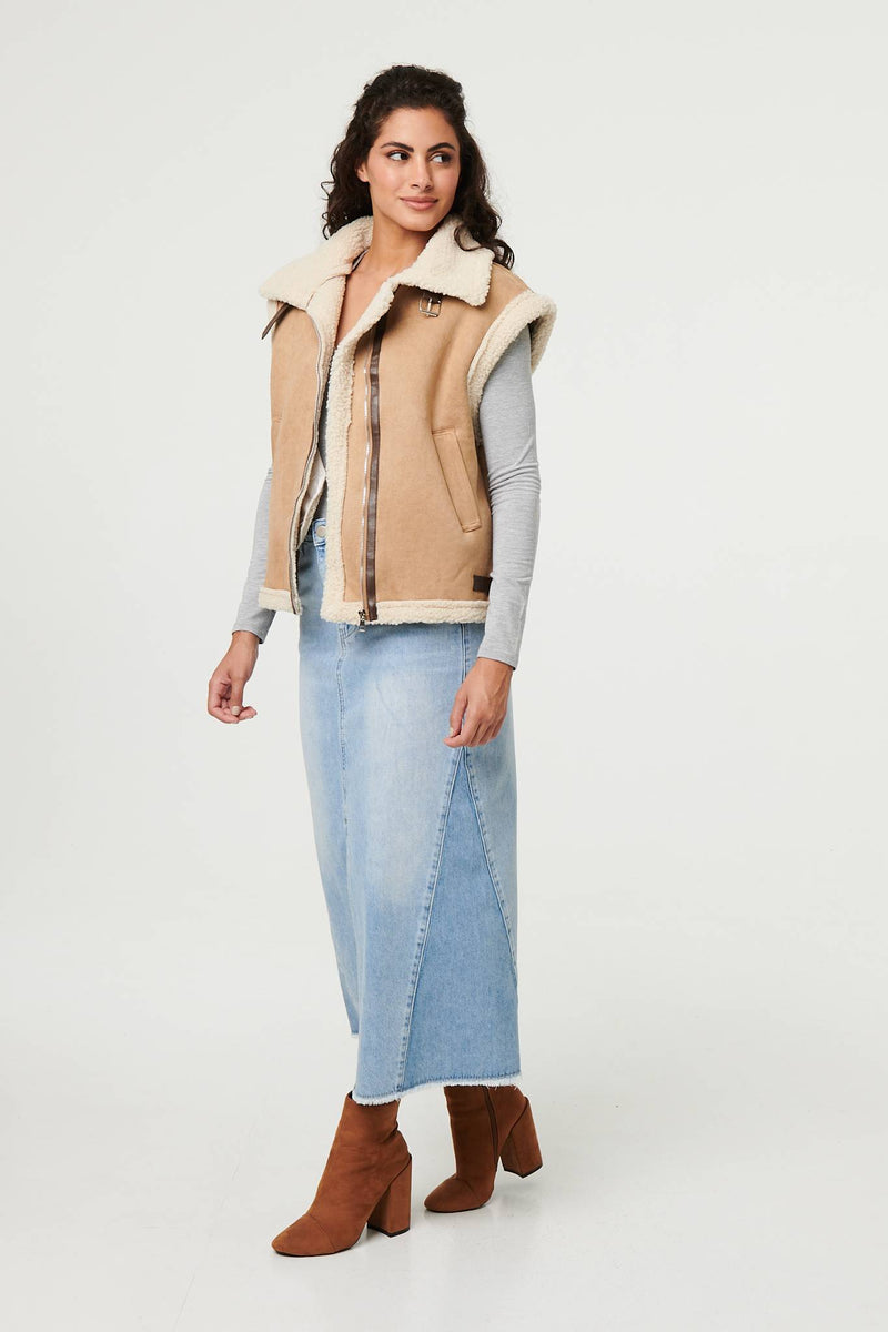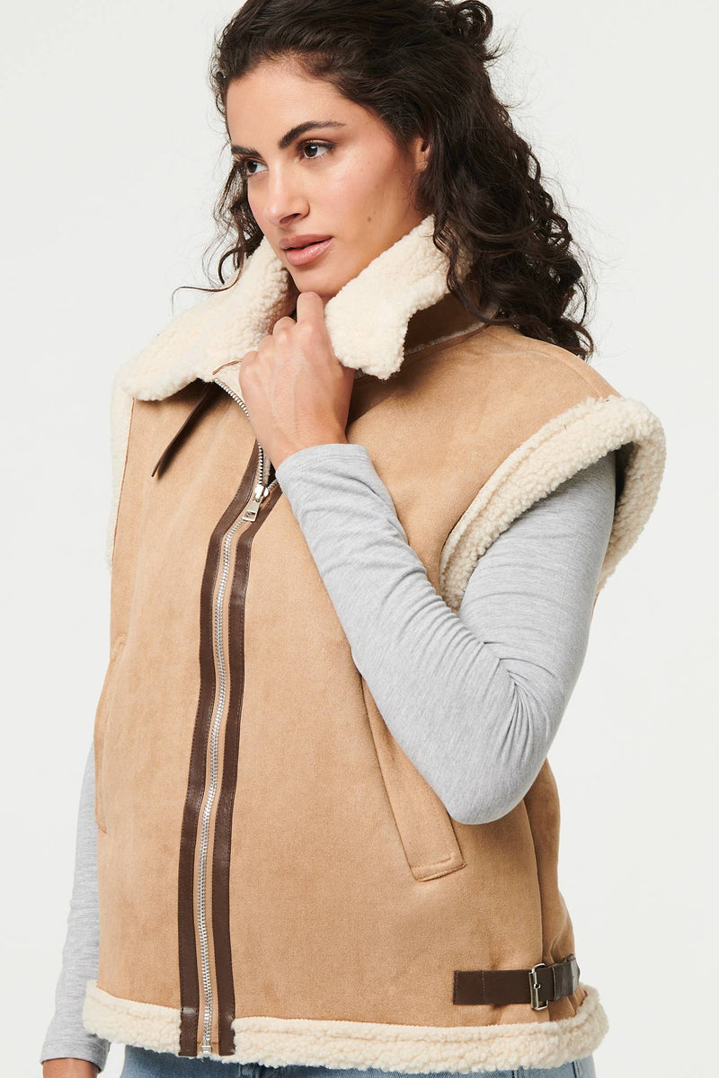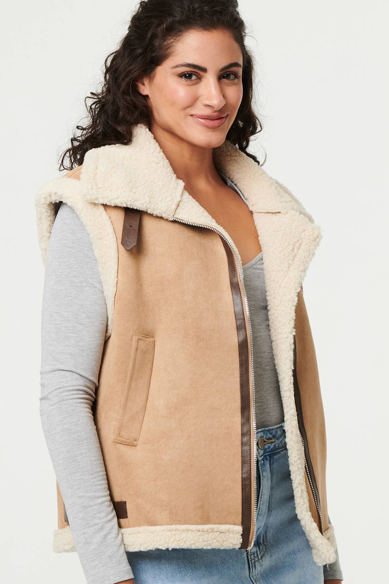 Add an extra layer with this beautifully soft gilet. It's made from a suedette texture material and has a cosy faux fur lining inside. It also has a zip front, buckle details and a wide collar. Wear it with a relaxed or formal outfit for instant style and warmth.