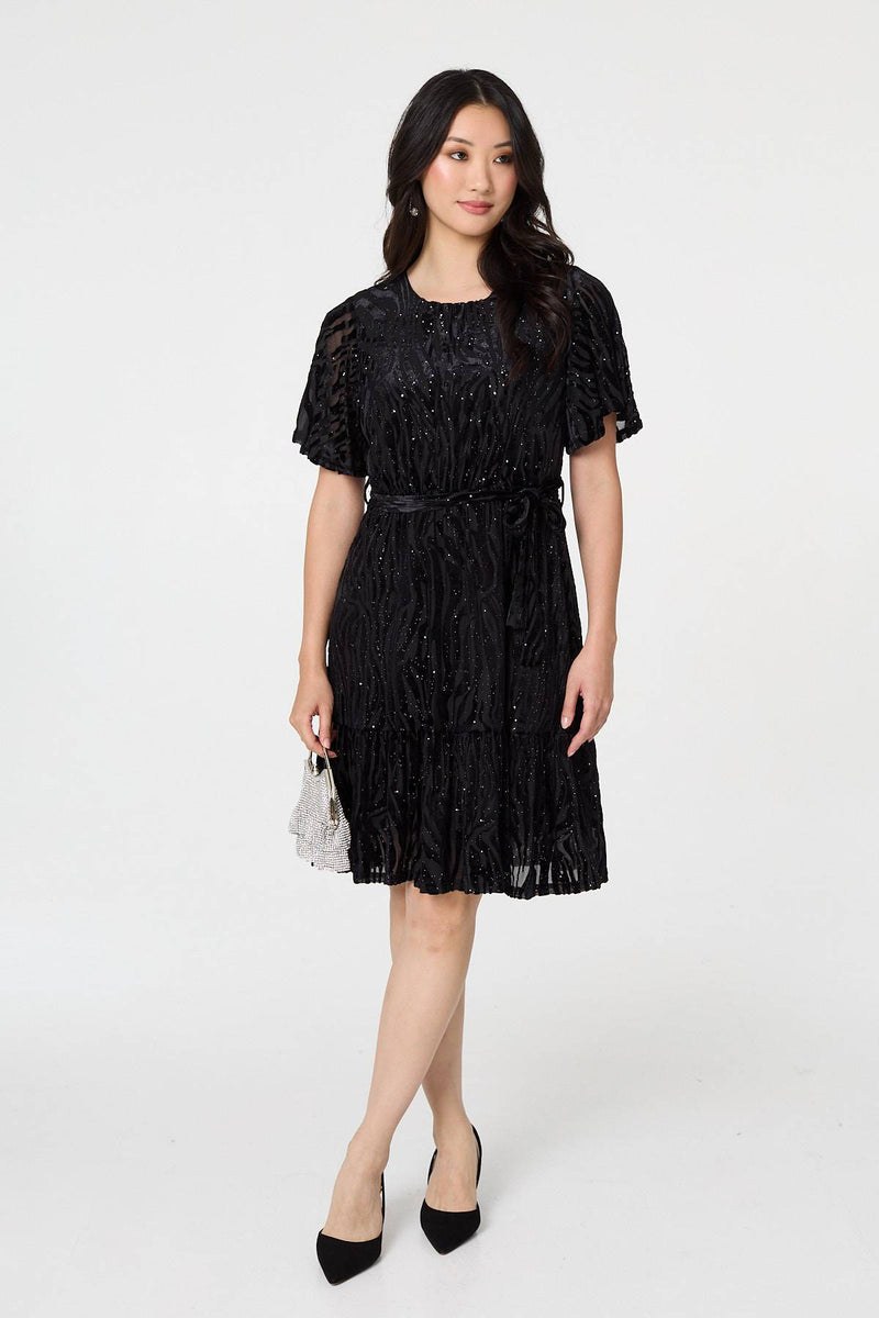 This sparkly dress is a must-have for special occasions. It's made from a semi sheer mesh texture material, complete with sequin embellishments and a tie waist for the perfect fit. It has a knee length hem and 1/2 sleeves with a slightly flared shape. Wear this dress with heels for your next party or formal occasion.