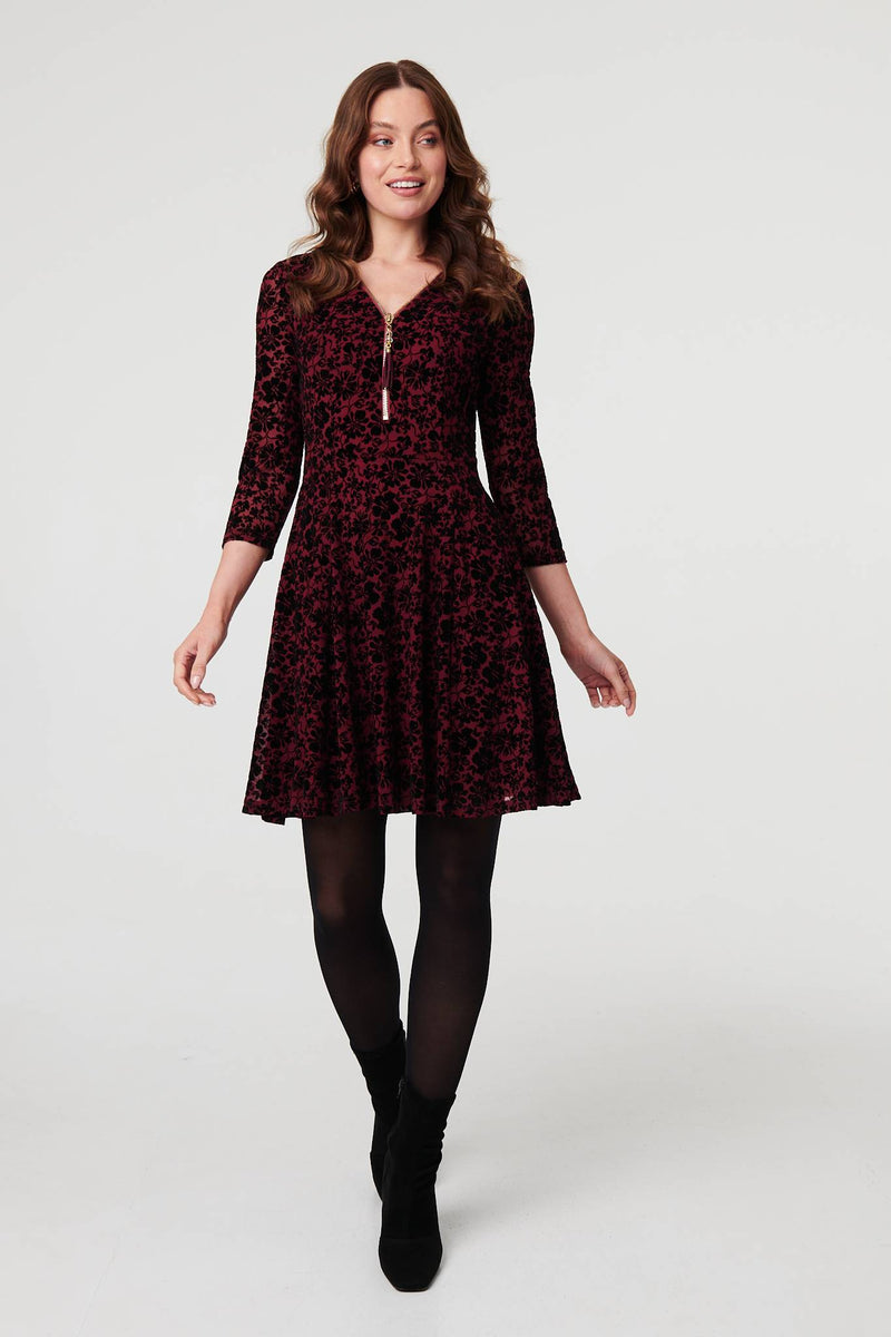 Floral Zip V-Neck Short Skater Dress in Red