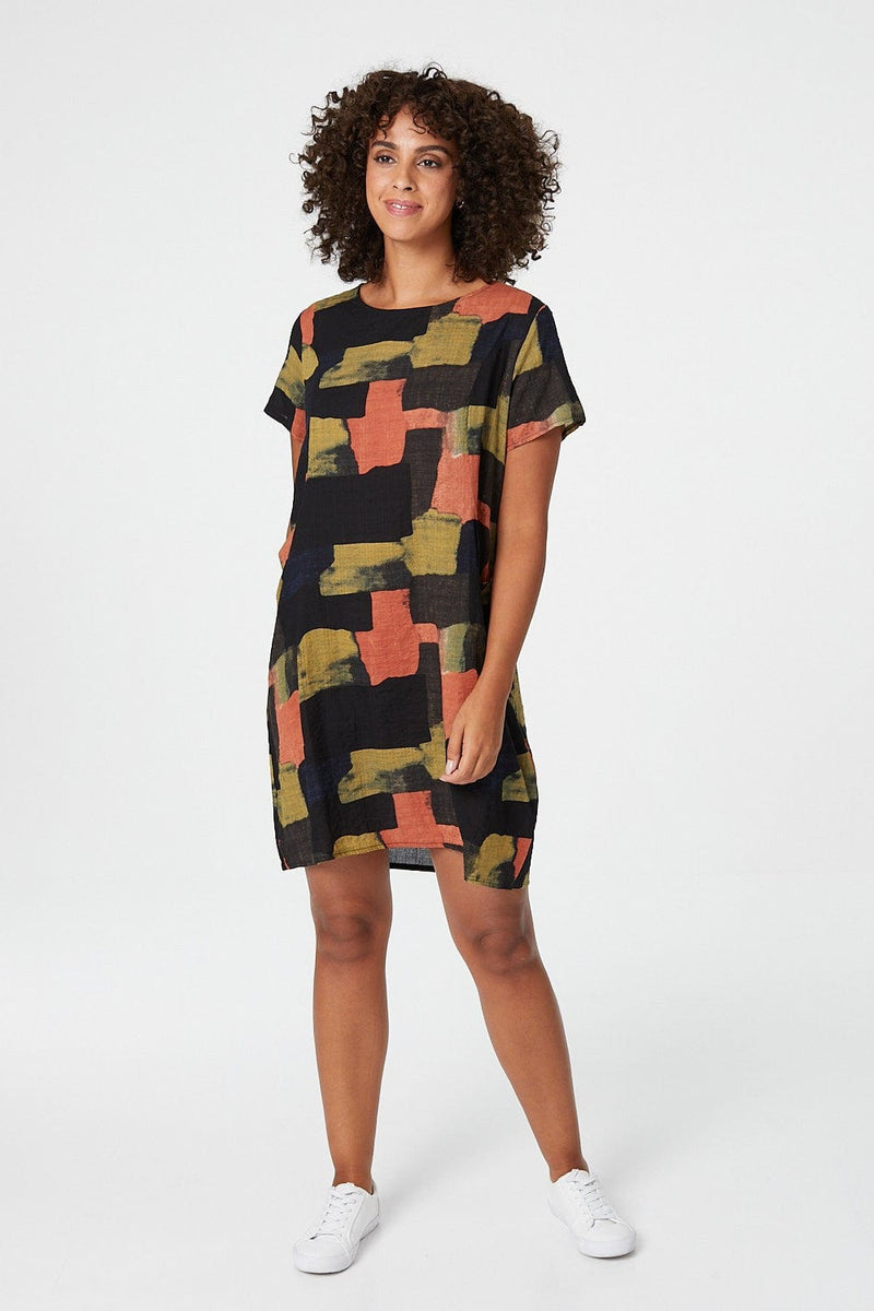 Add a bold yet comfortable abstract print shift dress to your collection. With a round neck, short sleeves, pockets and an oversized fit sitting at the knee. Pair with flat sandals and a sun hat for the perfect holiday outfit.