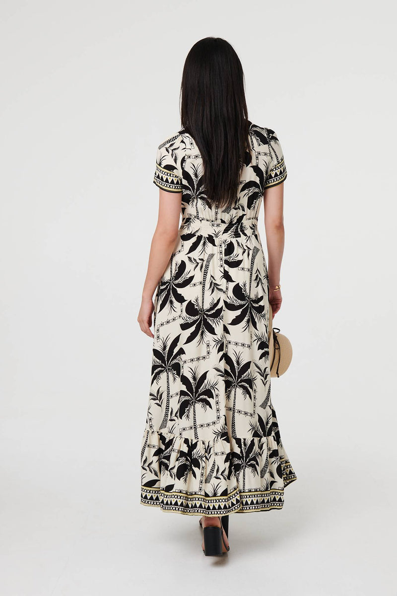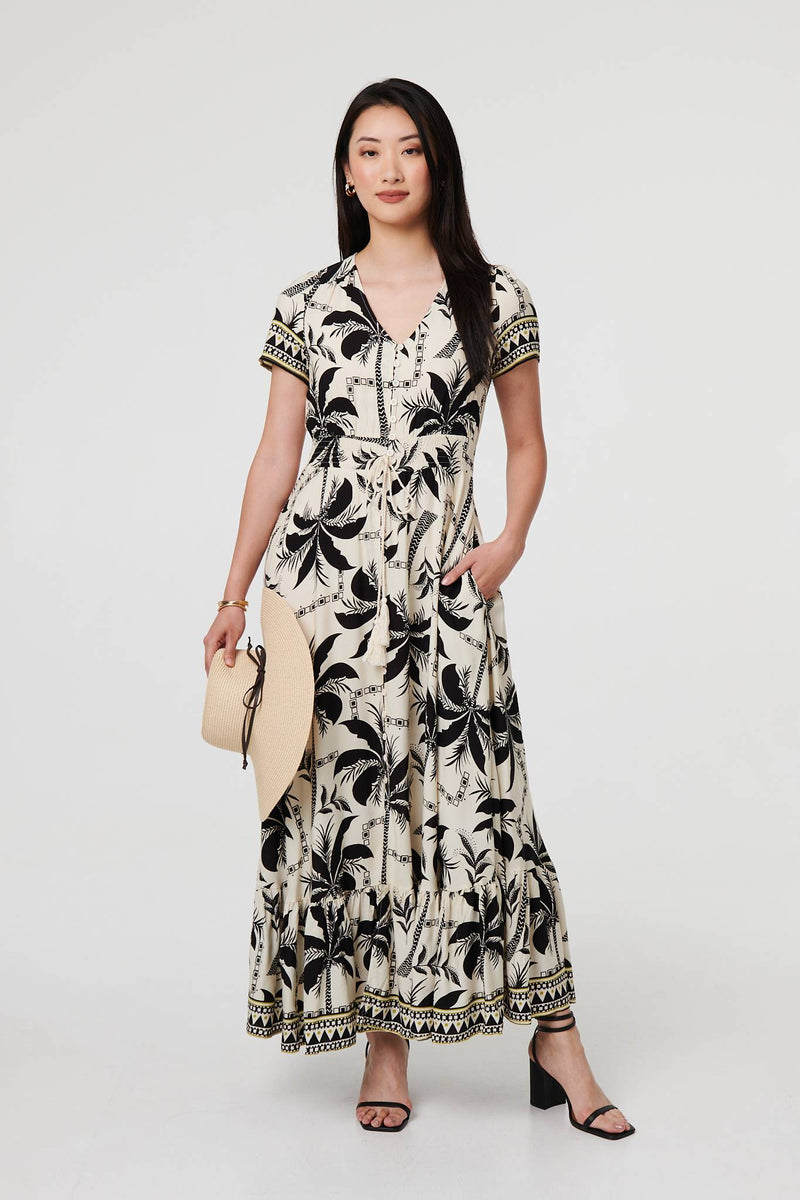 This flattering smock dress has a shirred waist panel, complete with a beautiful tassel trim detail. It has short sleeves, a v-neck, and front buttons. The skirt has a maxi length hem that suits both casual and formal dress codes. Simply swap out heels for trainers and a denim jacket for a relaxed look.