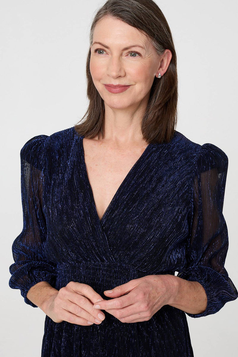 At your next special occasion or formal event, this maxi dress is the perfect outfit option. It's made from semi sheer mesh materials with a shimmery, sparkly finish; and it has 3/4 puff sleeves, a v-neck and a tiered shape. Wear it with heels and a clutch bag.