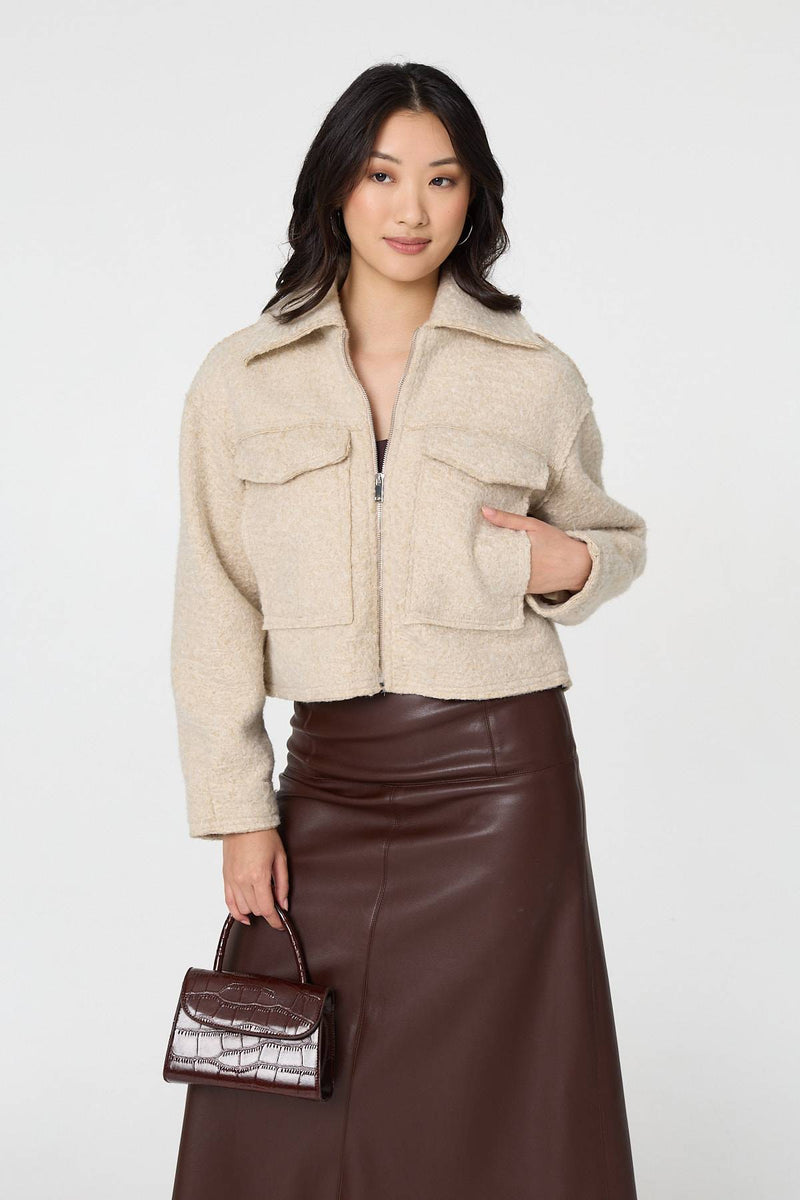 This jacket has a classic boxy shape, with a cropped hem that makes it perfect for layering. It features a statement collar, pocket front details and a zip. The long sleeves have drop shoulders for a spacious fit. Wear this jacket for smart, casual and professional occasions.