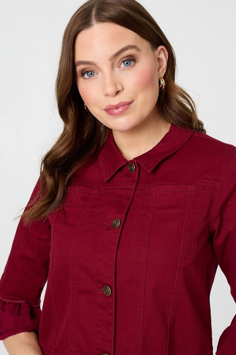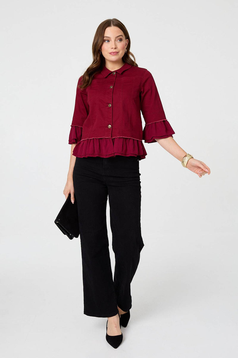 Frilled Hem 3/4 Flare Sleeve Shirt in Burgundy