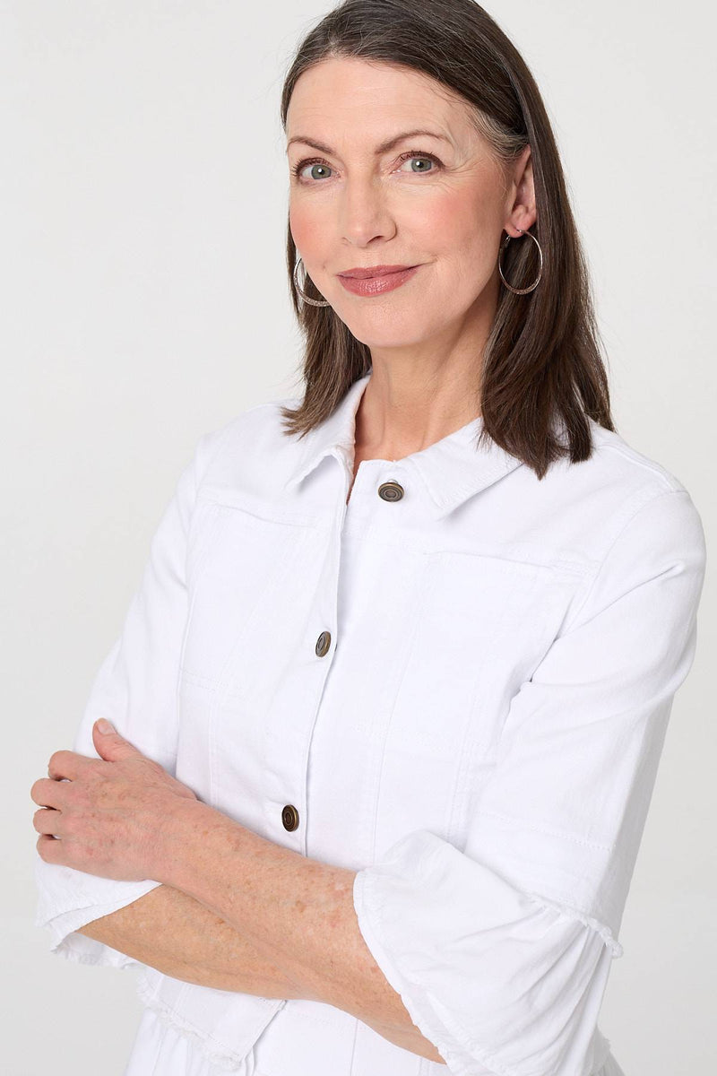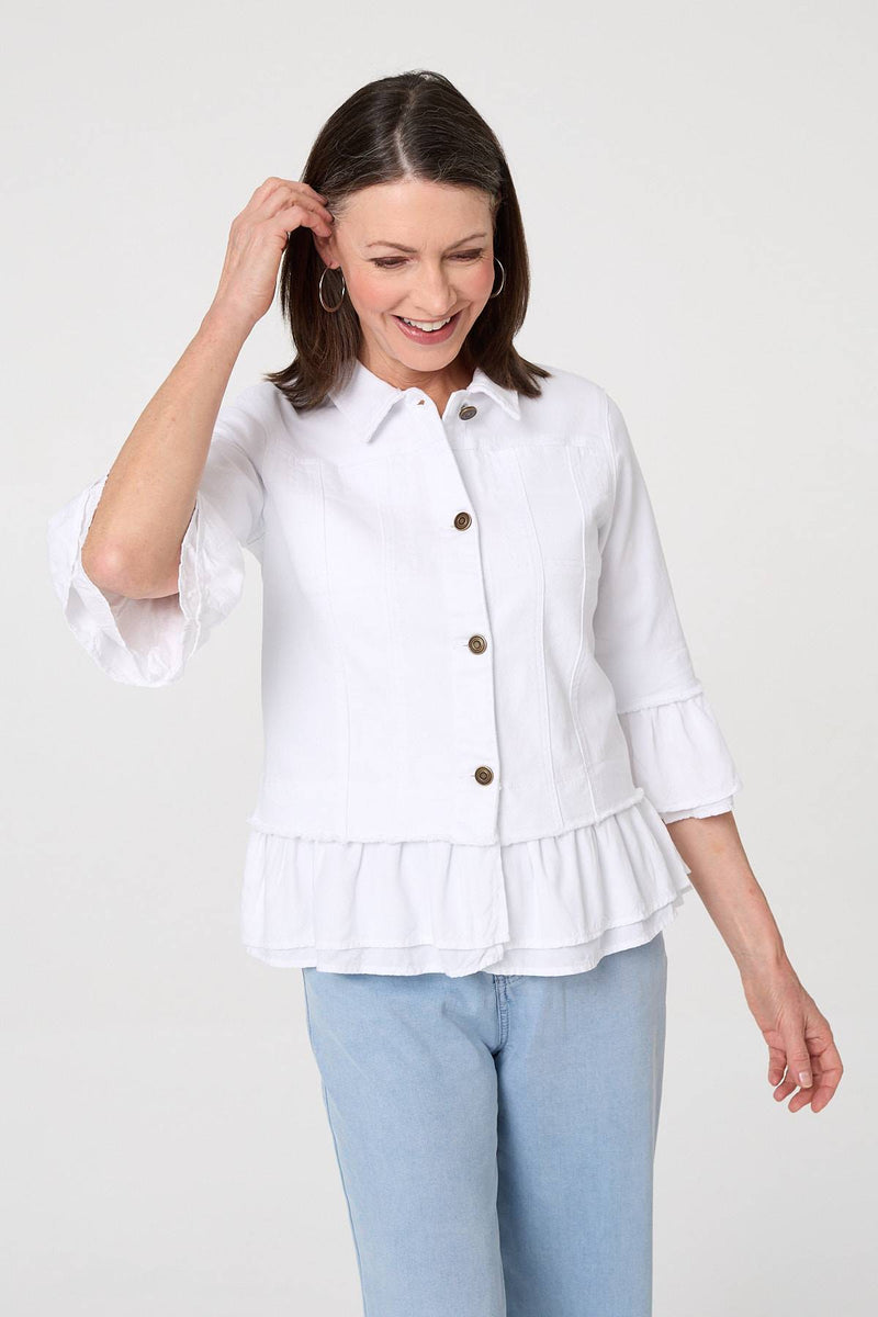 Flatter your figure with this smart peplum-style shirt. It has a beautiful frilled detail around the hem and 3/4 sleeves, giving it a floaty and feminine look. It also features a collar and buttons. Wear it for the weekend with blue jeans, or elevate with a fitted skirt for a smart occasion.