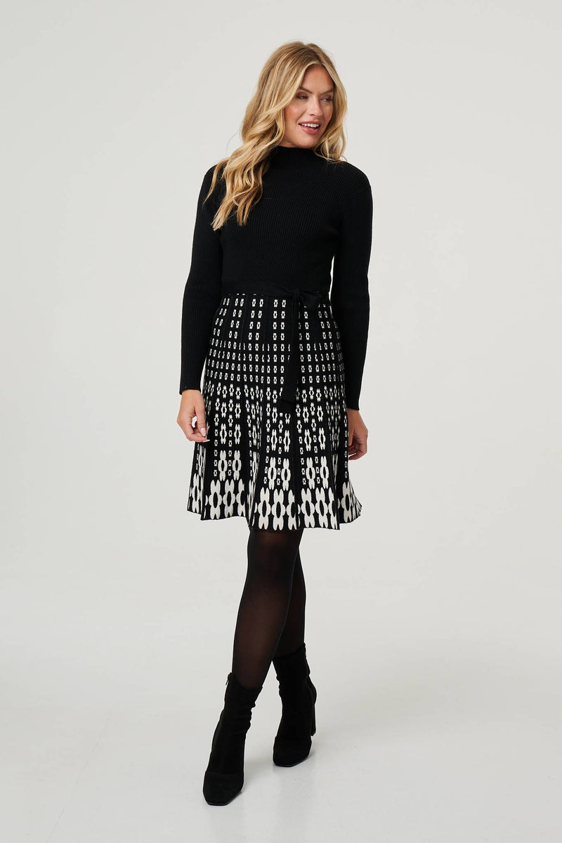 Stay cosy and stylish in this elegant dress. It's made from a soft textured material and has long sleeves, a high neck and a tie waist. The skirt has a skater shape and reaches knee length for a smart finish. It's perfect for pairing with tights and boots.