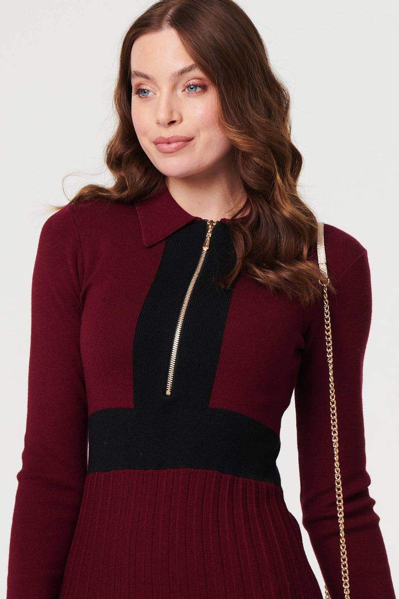Stay cosy and on trend in this essential knee length dress. It's made from a soft pleated knit material, and has a flattering skater shape that will flare out around the waist. It also features a zip front detail, a collar and long sleeves. Wear it with black tights and your favourite autumnal boots.