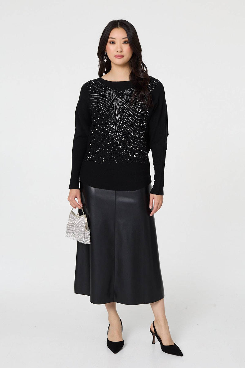 Add extra sparkle to your look with this embellished jumper. It has eye-catching sequins and diamantes on the front, along with batwing sleeves and a spacious relaxed fit. Wear it with black faux leather for a smart, festive look.