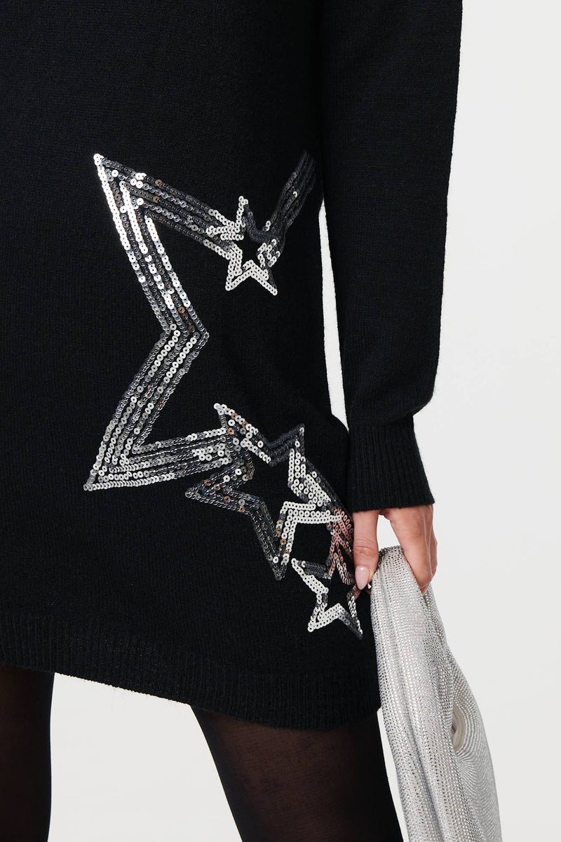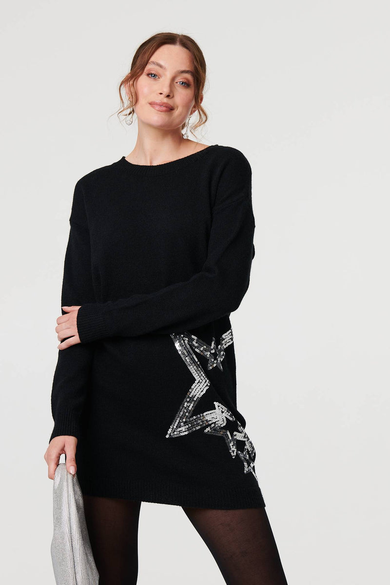 This beautiful jumper dress is adorned with a shimmery sequin star design. It has long sleeves with drop shoulders, a relaxed fit and a short length hem. Layer it over tights and pair with boots for a shimmery evening out look.