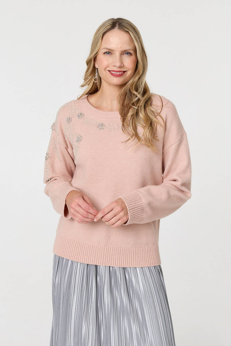 This cosy jumper is finished with sparkly details to add some extra shimmer to your look. It has a relaxed fit, a round neck and a thigh length hem. Wear it with a matching metallic skirt for your next special occasion this season.