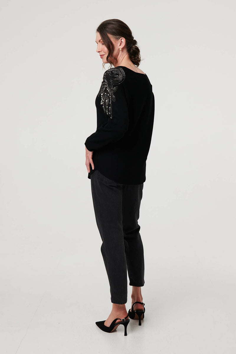 This elegant jumper has a sparkly detail on each shoulder, so it's perfect for festive occasions and adding subtle shimmer to your look. It has a relaxed fit, long batwing sleeves and a round neck. It also features a thigh length hem that layers beautifully over your trousers or skirt.