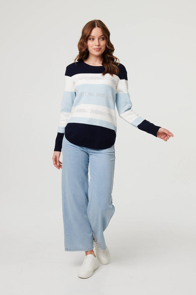 Add some subtle sparkle to your look with this beautiful jumper. It has long sleeves and a slim fit, with a curved thigh length hem for a flattering look on all figures. It's finished with beautiful diamante details and has a classic round neck.