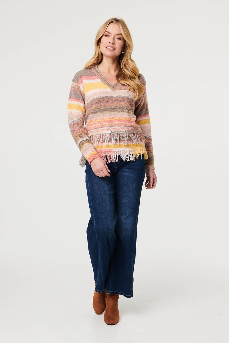 This beautiful fringed jumper features elegant tassel details - along with a relaxed boxy fit, long sleeves with drop shoulders, and a v-neck. Wear this jumper with your favourite blue jeans for a casual workwear or weekend outfit.