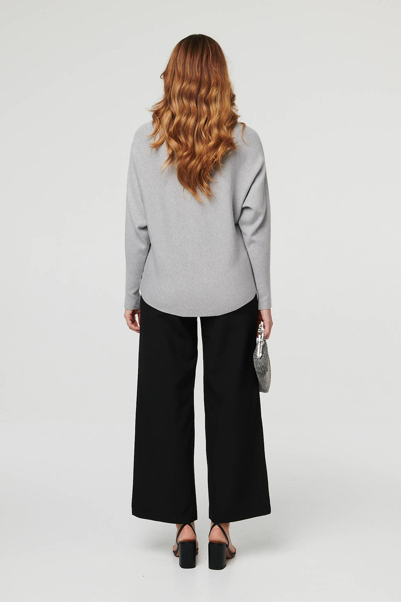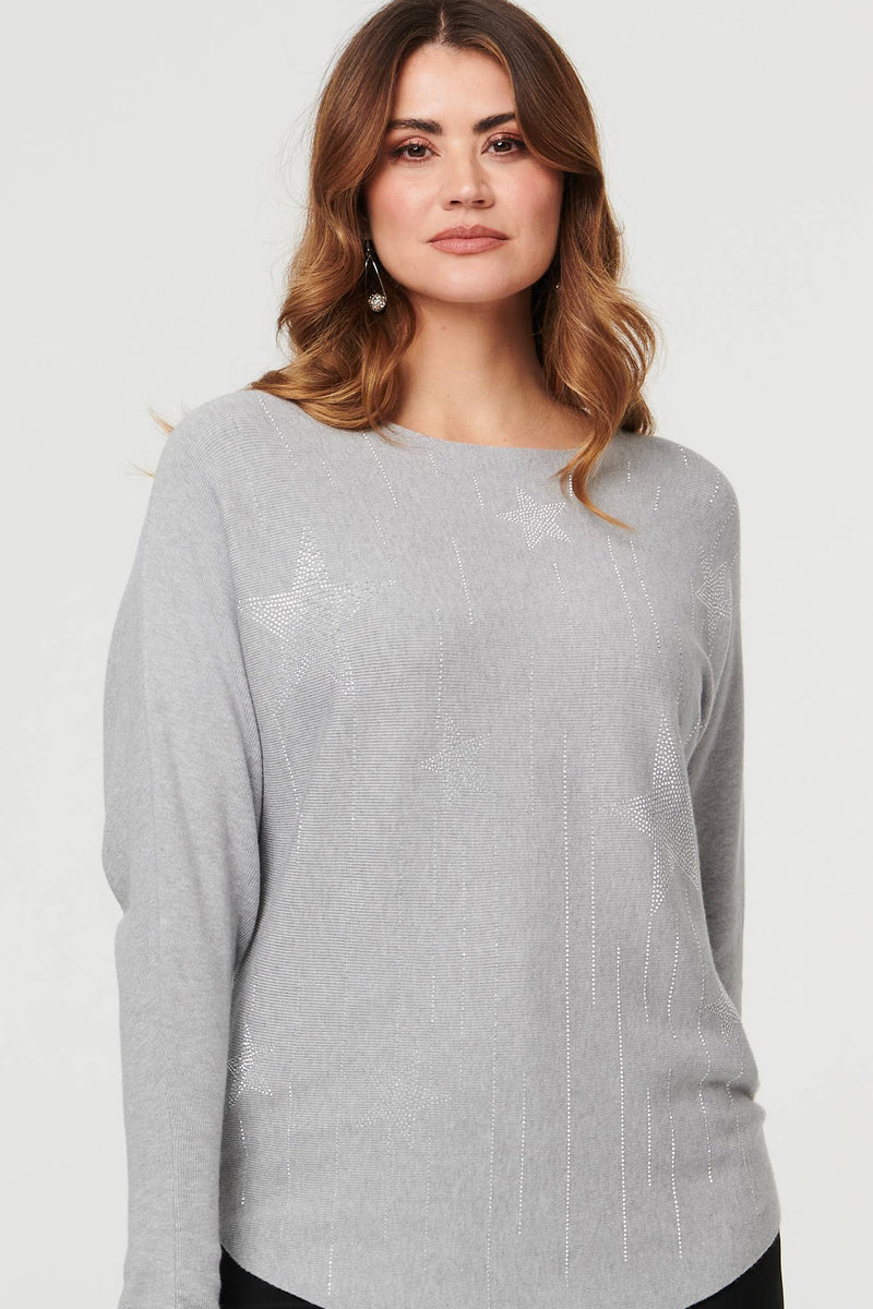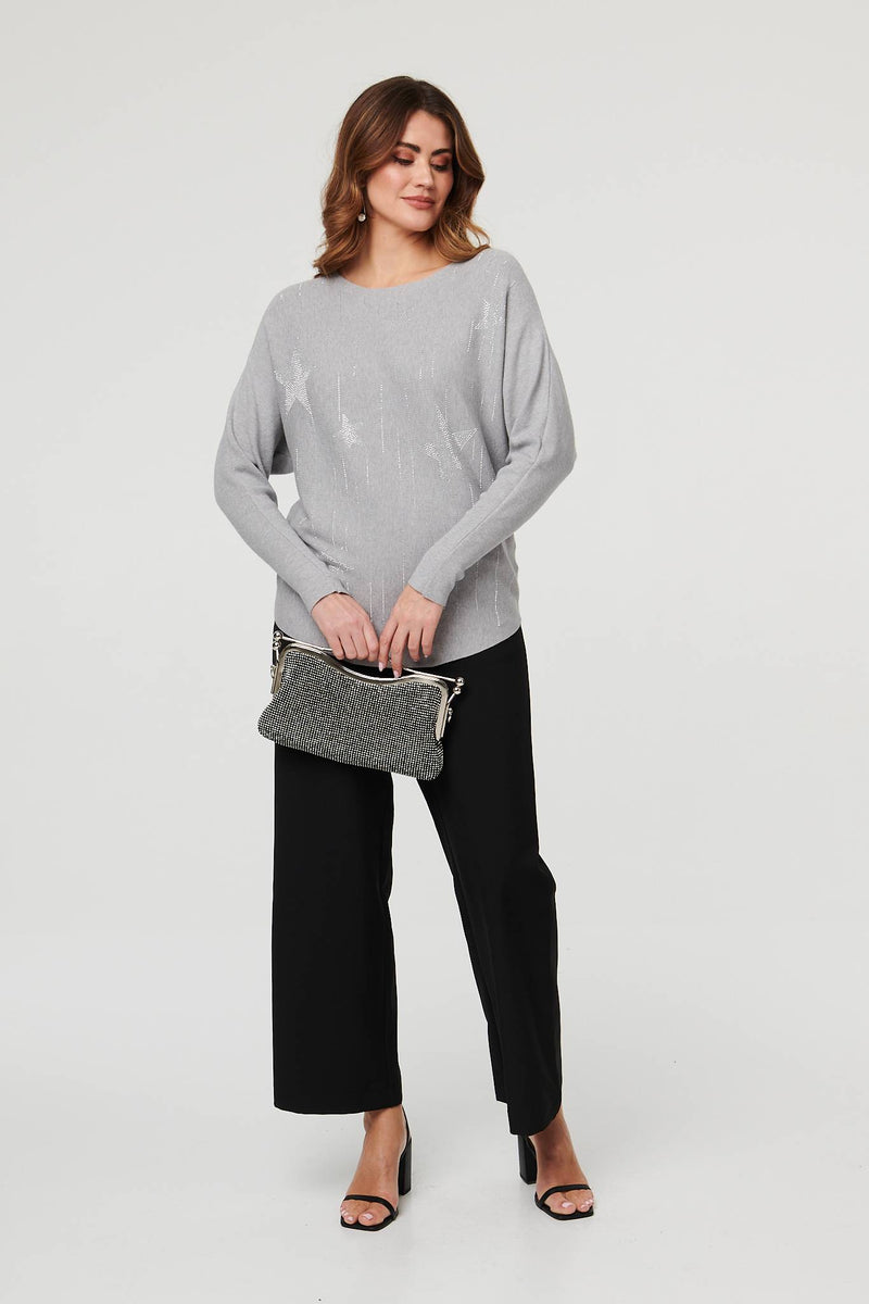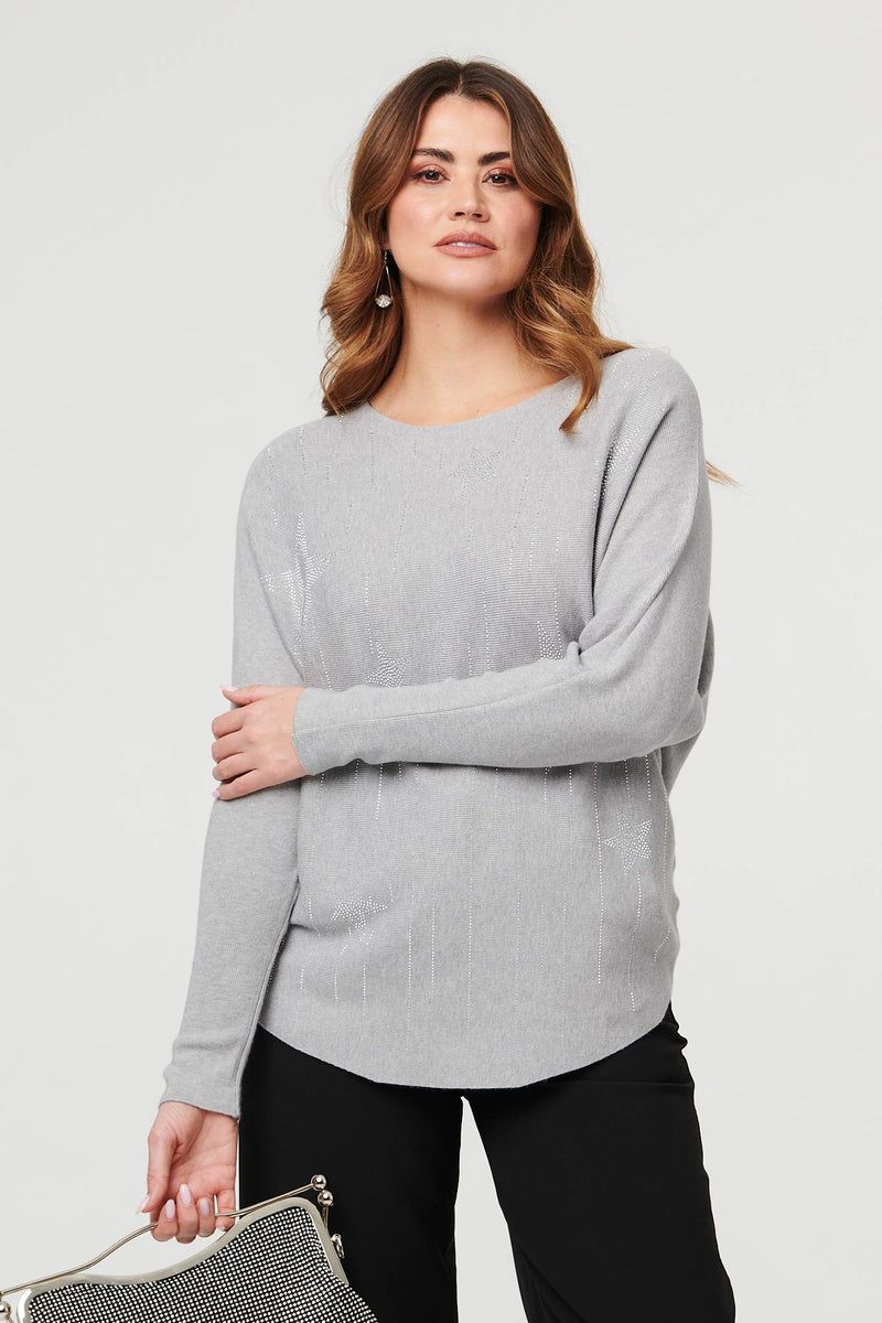 Bring extra sparkle to your look with this shimmery diamante jumper. It has long batwing sleeves, a round neck and a hip length hem. The hip length hem means this jumper can be layered over your waistband, or tucked into your skirt or trousers.