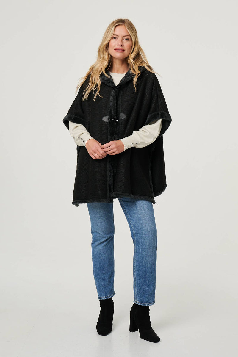 This poncho is as elegant as it is cosy. It features a super-soft faux fur lining and a spacious hood, with 1/2 sleeves and a boxy shape. It fastens with buckles on the front and has a longline fit. Wear it over formal or smart outfits to stay warm on a chilly day.