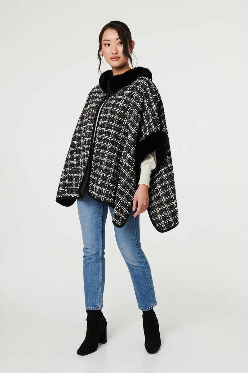 This elegant poncho is the perfect extra layer for any smart evening outfit. It has an oversized shape with a longline fit, 3/4 sleeves and an open front. Fasten the buckle at the neckline and stay cosy thanks to faux fur trims. This poncho layers beautifully over trousers, dresses and skirts.