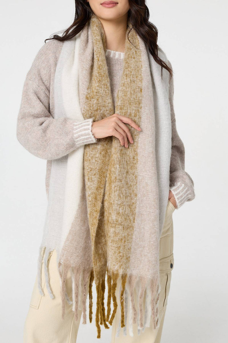 Keep your cool-weather look on trend in this stylish oversized scarf, featuring a fringed hem. It also has a large rectangular shape so you can wrap it around your shoulders for ultimate cosiness this season.