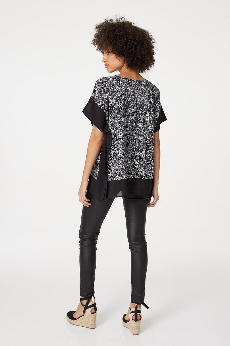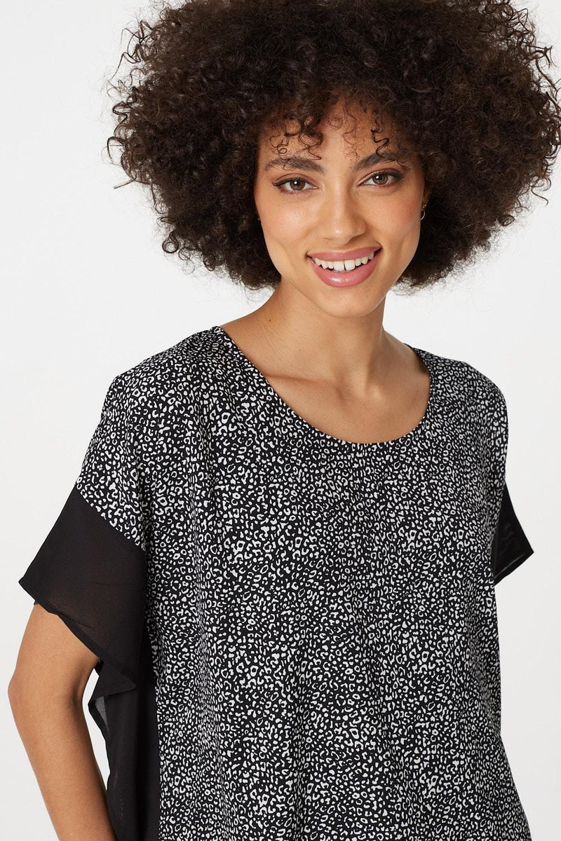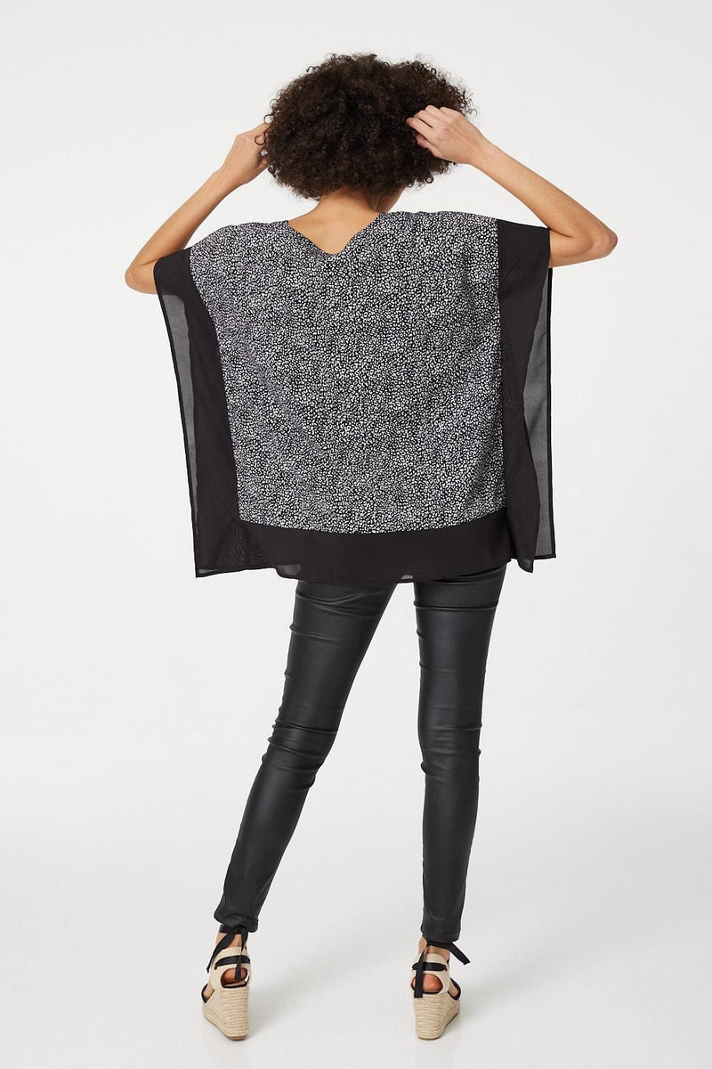 Make a statement with this leopard print poncho blouse top. It has a round neck, short sleeves, an oversized fit and a thigh length hem. Pair with fitted trousers and heeled wedges for a standout style that's perfect for date night or drinks with the girls.