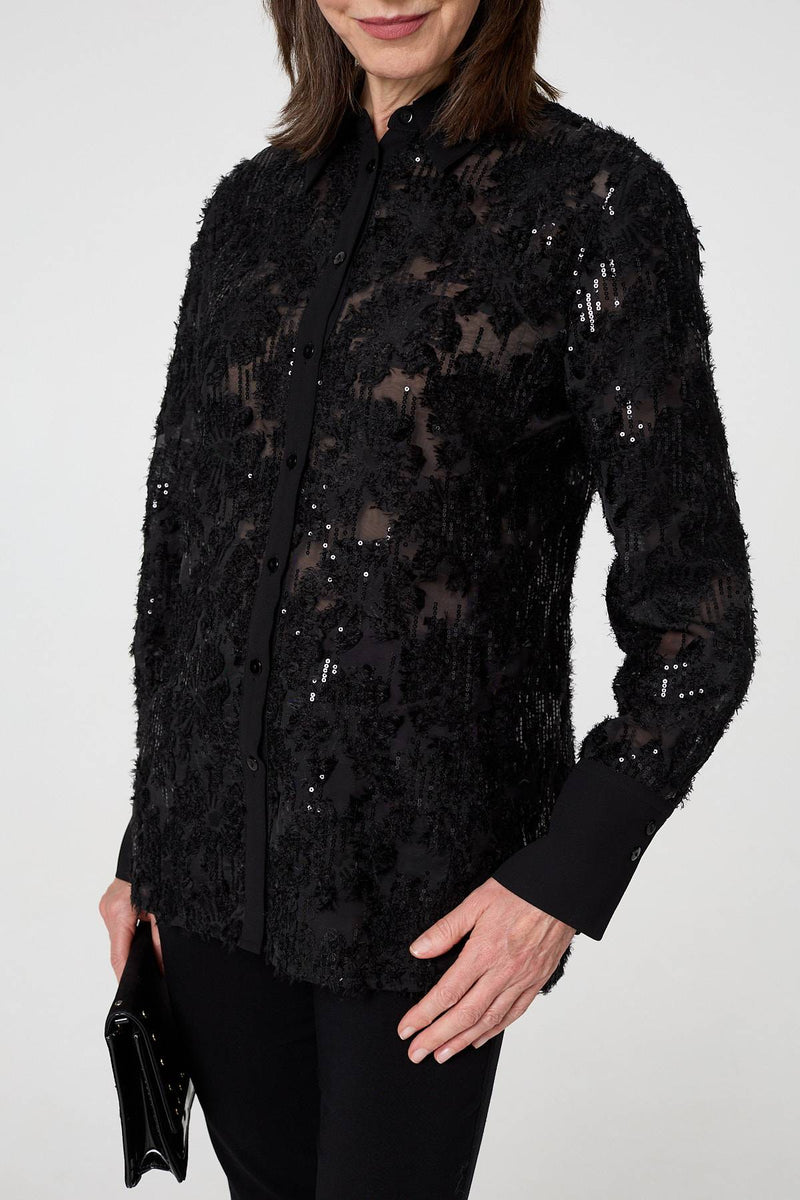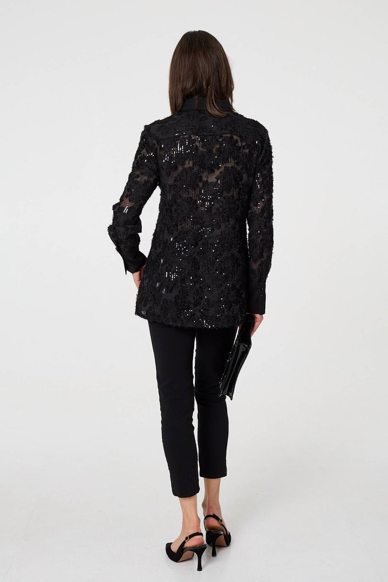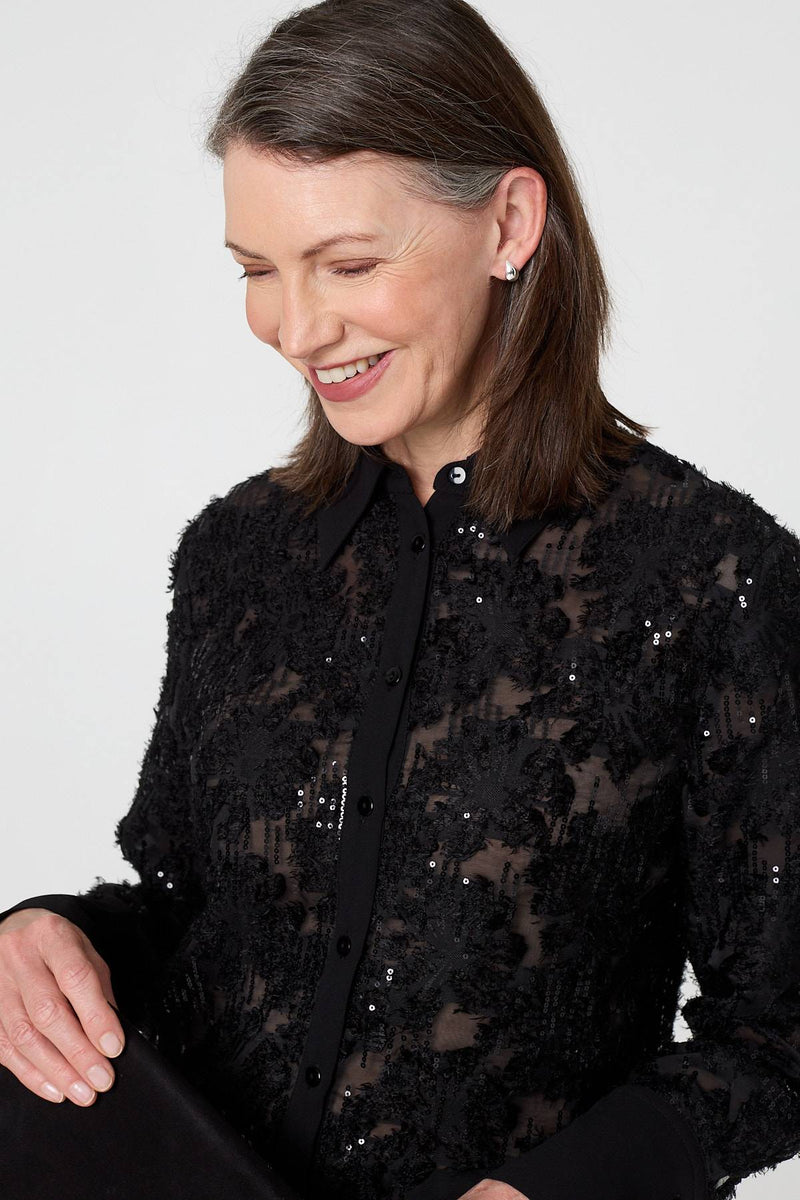 Upgrade your collection with this beautiful lace shirt. It's made from a semi sheer floral lace material, complete with beautiful sequin details. It features long sleeves, a collar and buttons on the front. The thigh length hem layers over trousers and skirts, or you can tuck it in.