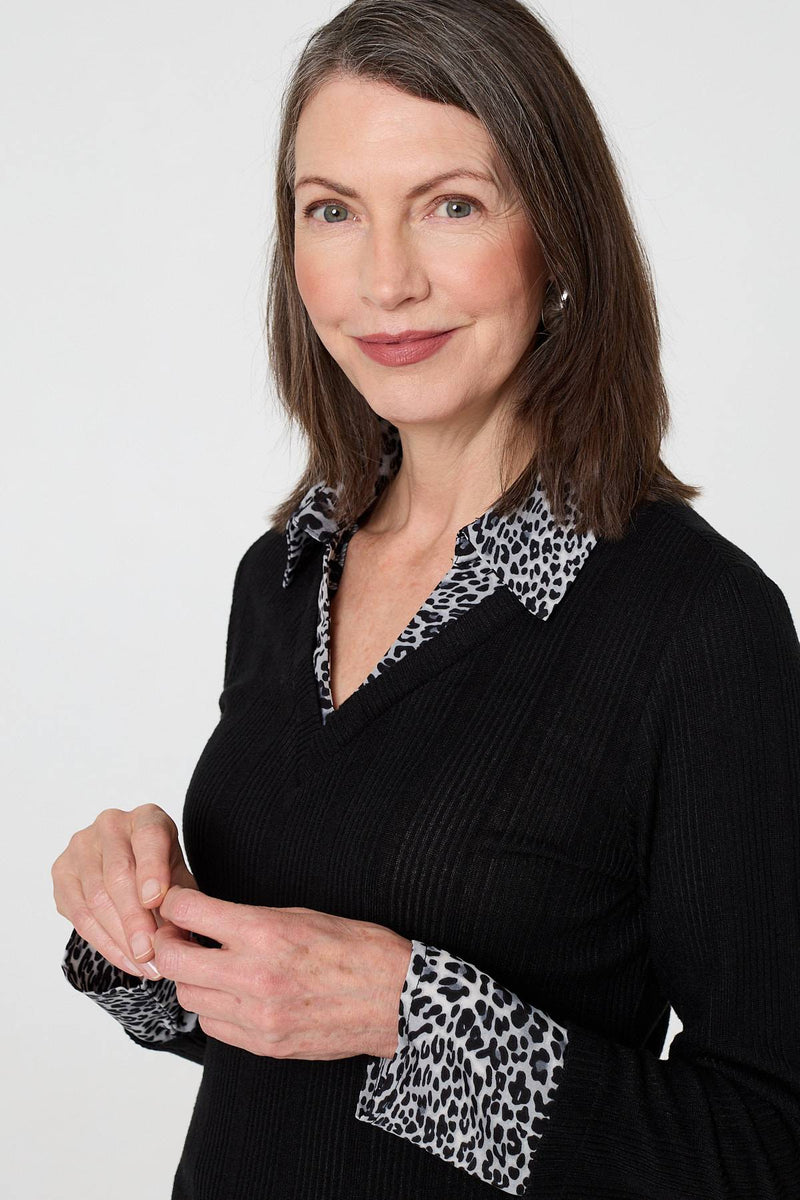 Dress for work and other smart occasions in this 2-in-1 top - featuring a shirt underneath and a jumper layered over the top. It has a classic collared v-neck, long sleeves and a hip length hem. The jumper layer has a textured knit finish.