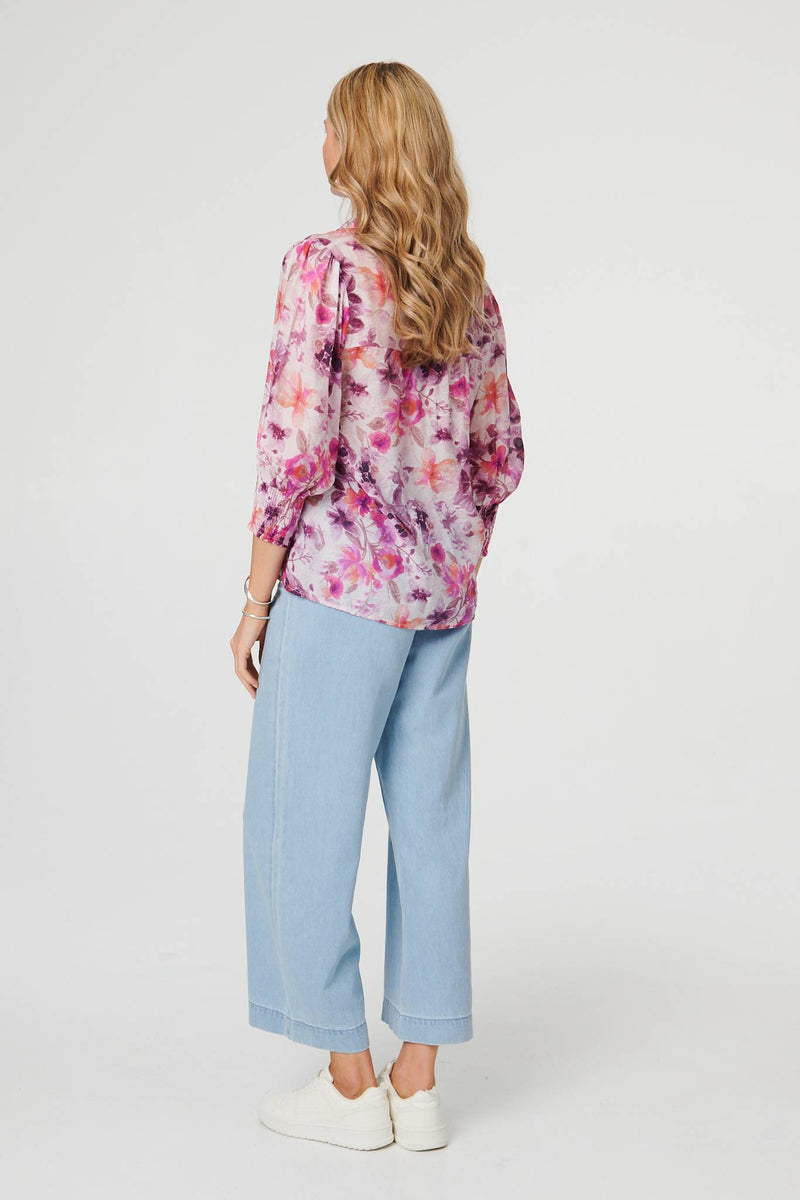 Floral 3/4 Puff Sleeve Relaxed Shirt in Purple